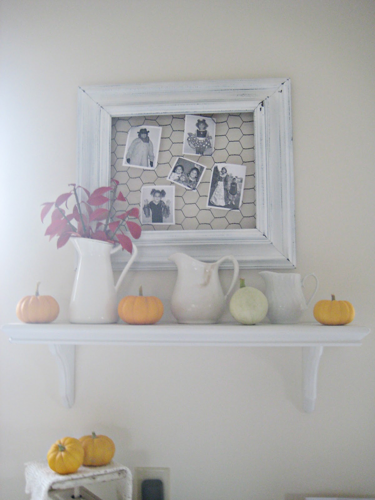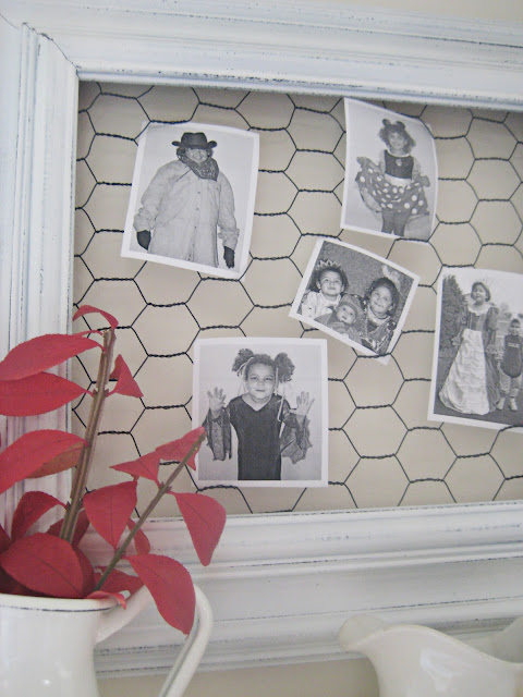 Above the shelf, I've added a few of my favorite photos of the girls from past Halloweens to the chicken wire frame. I simply printed them in black and white unto white cardstock, cut them out and tucked them into the chicken wire.