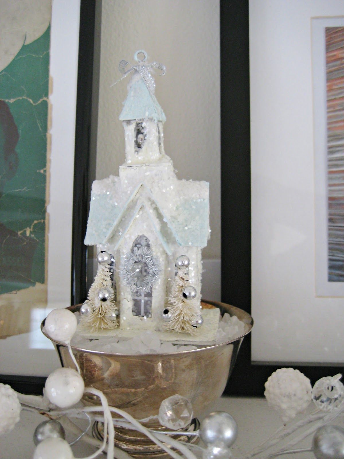 The top ledge is filled with similar items like another handmade glitter house (sadly the only one I've had time to make this year) and vintage Christmas cards.