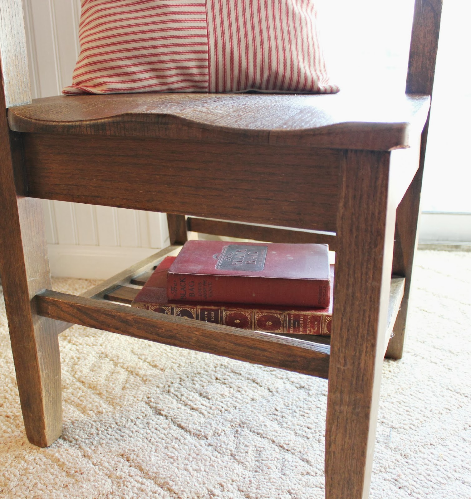 A newly sewed ticking striped pillow adds a little softness and looks so pretty against the dark stained wood.