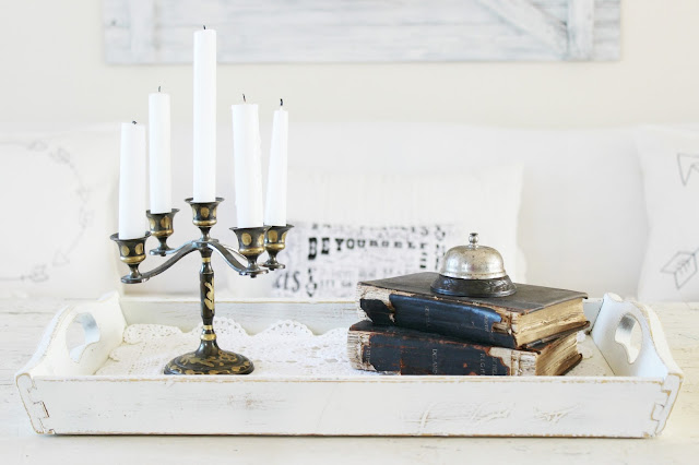 Thrift store finds like this candelabra and tattered books helped me not only bring in more accents of black but also to give the room an aged, collected overtime look that I like.