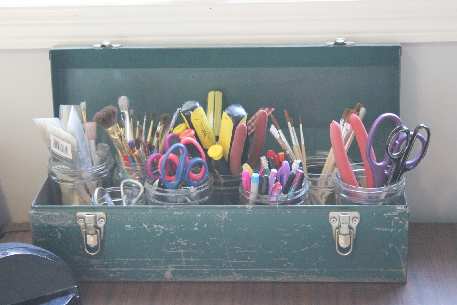 The jars hold paint brushes, pens/pencils, scissors, glue sticks, screw drivers, wire cutters, can openers and so much more.