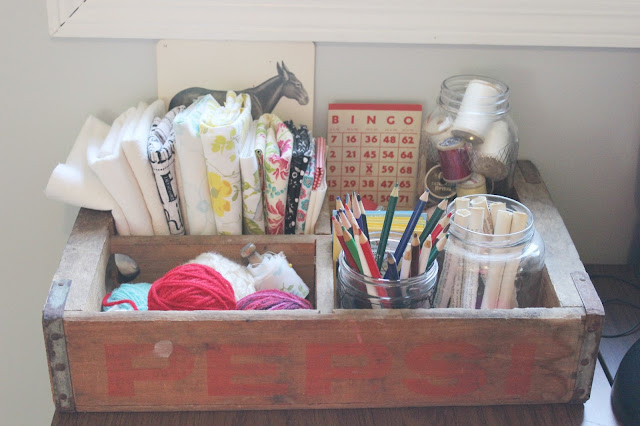 An old Pepsi crate helps me corral colored pencils, fabric scraps, and multiple crafting supplies I tend to reach for often.