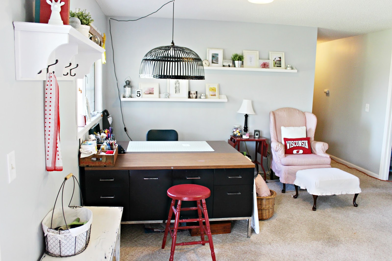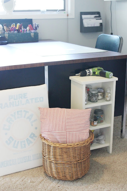 On the side of the desk I have propped up a homemade ironing board and placed a over-sized basket filled with fabric. The pillow on top helps hide the mess inside the basket, LOL.