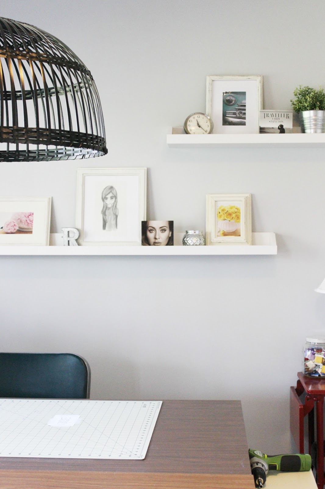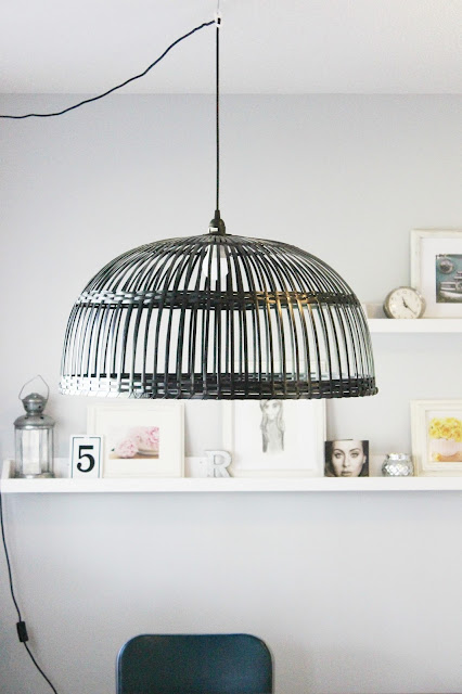 Above the desk I have hung this oversized wicker lamp that I picked up from Ikea.